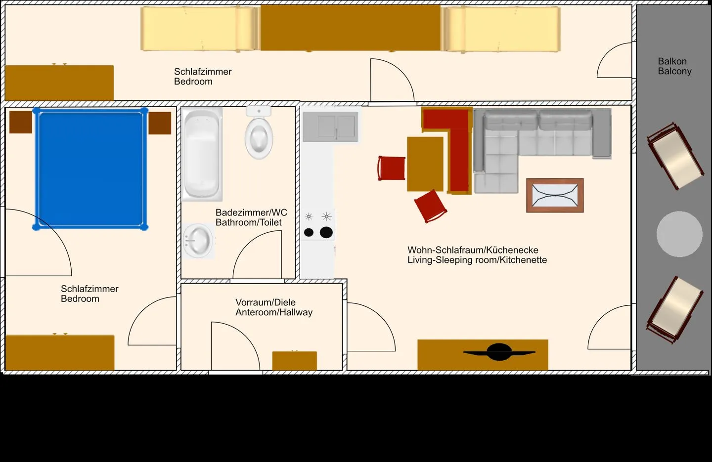 Ein modernes Sicherheitskonzept mit Rauchmelder und Feuerlöscher sorgt für ein beruhigendes Gefühl während Ihres Aufenthalts. Zu den weiteren Annehmlichkeiten zählen kostenfreies WLAN, digitaler TV-Anschluss, die Möglichkeit zu Fitness-Training oder Wellness in der Umgebung sowie eine komfortable Möblierung mit Sessel, Sofa, Kommode und Kleiderschrank.