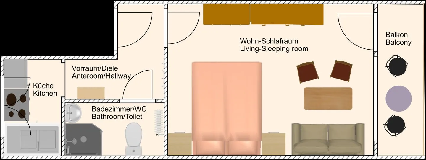 The fully equipped kitchen, designed as a separate unit, is equipped with all necessary kitchen utensils, including a two-burner stove, a refrigerator with a freezer compartment, a microwave, and a coffee machine. Here, you can prepare meals after an active day and enjoy them together at the dining table in the dining area. A shower in the bathroom, complemented by modern bathroom amenities, provides additional comfort.